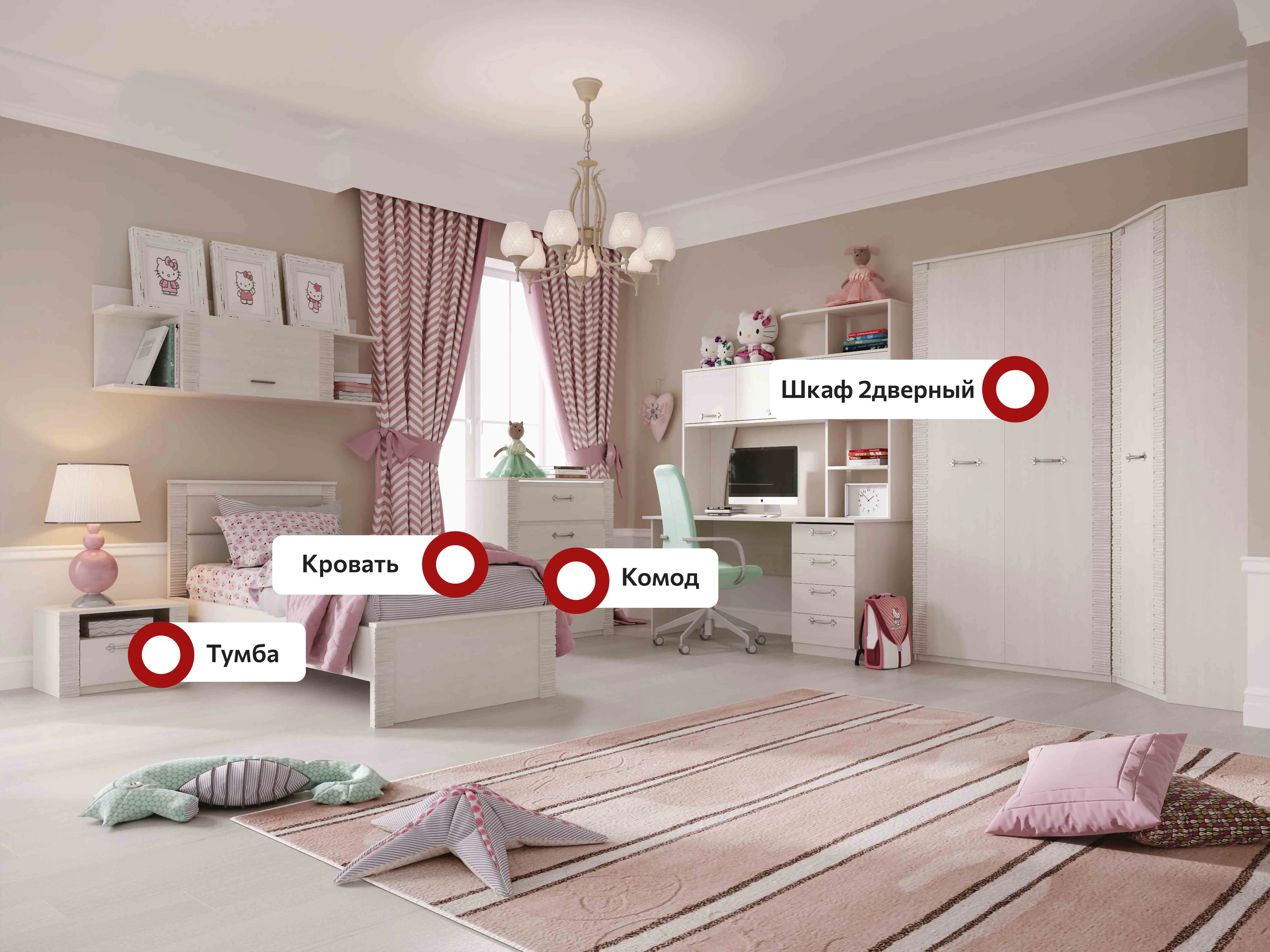 В состав коллекции входят: шкаф однодверный, шкаф угловой, шкаф двухдверный, комод, стол компьютерный, тумба прикроватная, кровать.