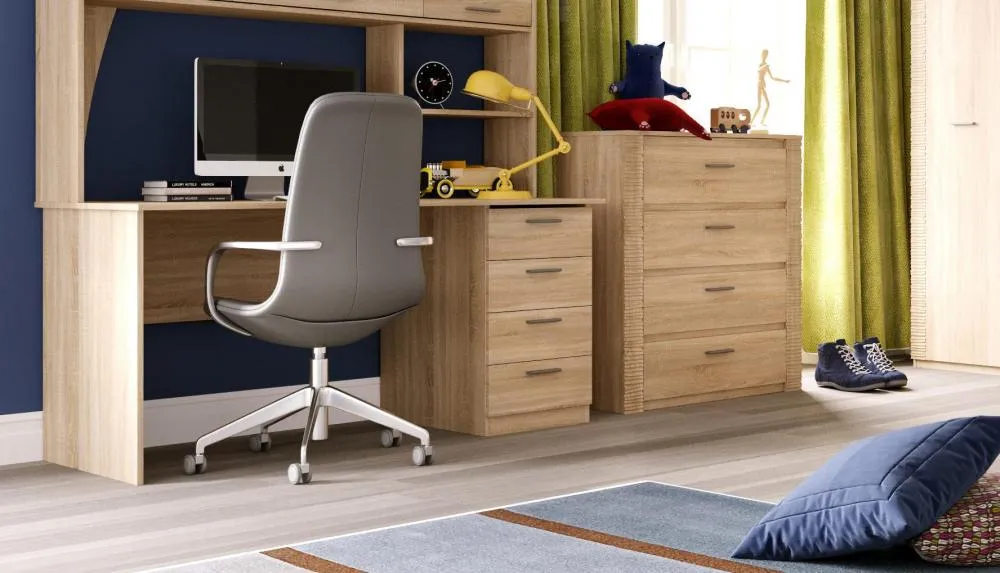 В состав коллекции входят: шкаф однодверный, шкаф угловой, шкаф двухдверный, комод, стол компьютерный, тумба прикроватная, кровать.
