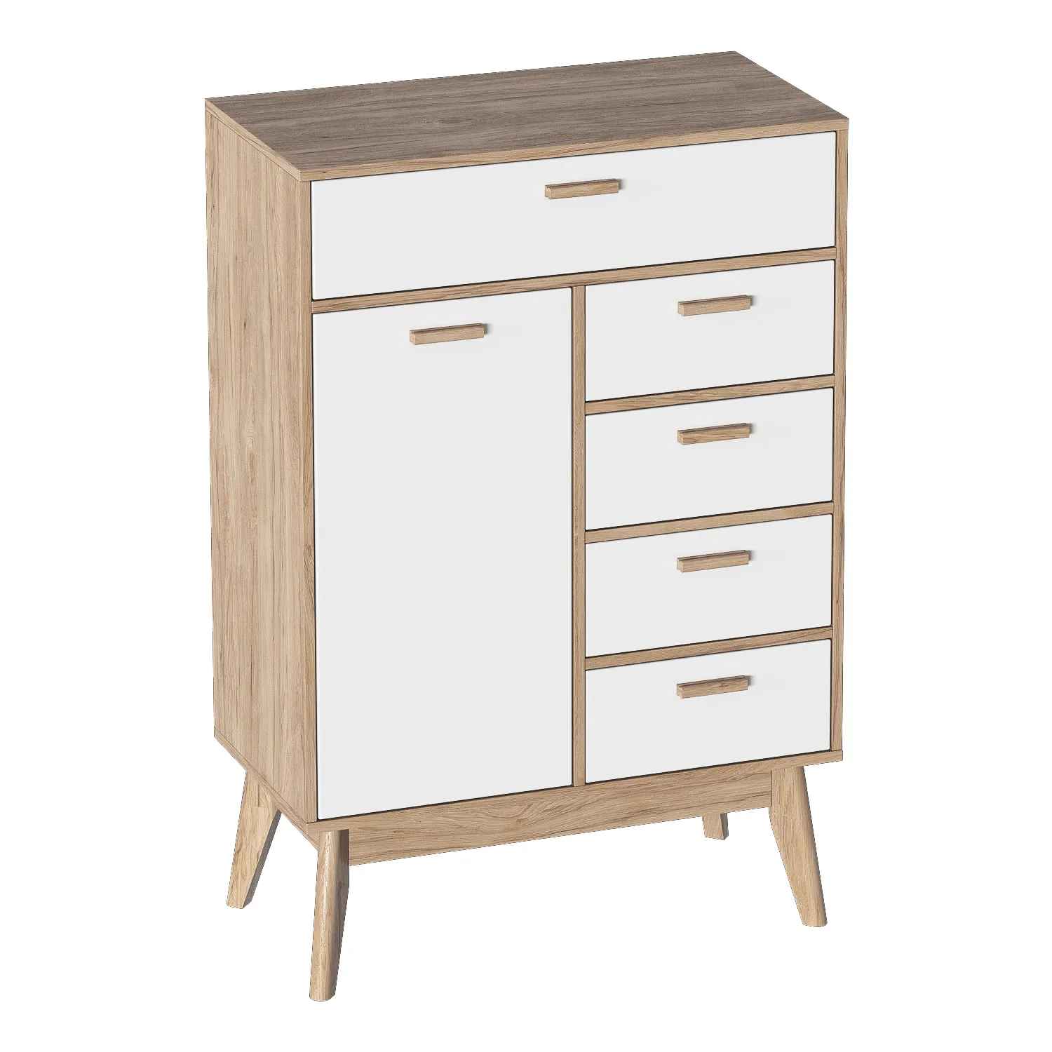 Ящики выдвигаются полностью, что облегчает доступ ко всему их содержимому. Дизайн расставленных под углом стильных опор из массива березы вдохновлен лучшими образцами стиля mid-century modern. Белоснежные фасады из МДФ нарядно смотрятся на фоне корпуса из ЛДСП цвета натурального дуба. Ручки выполнены из массива березы.