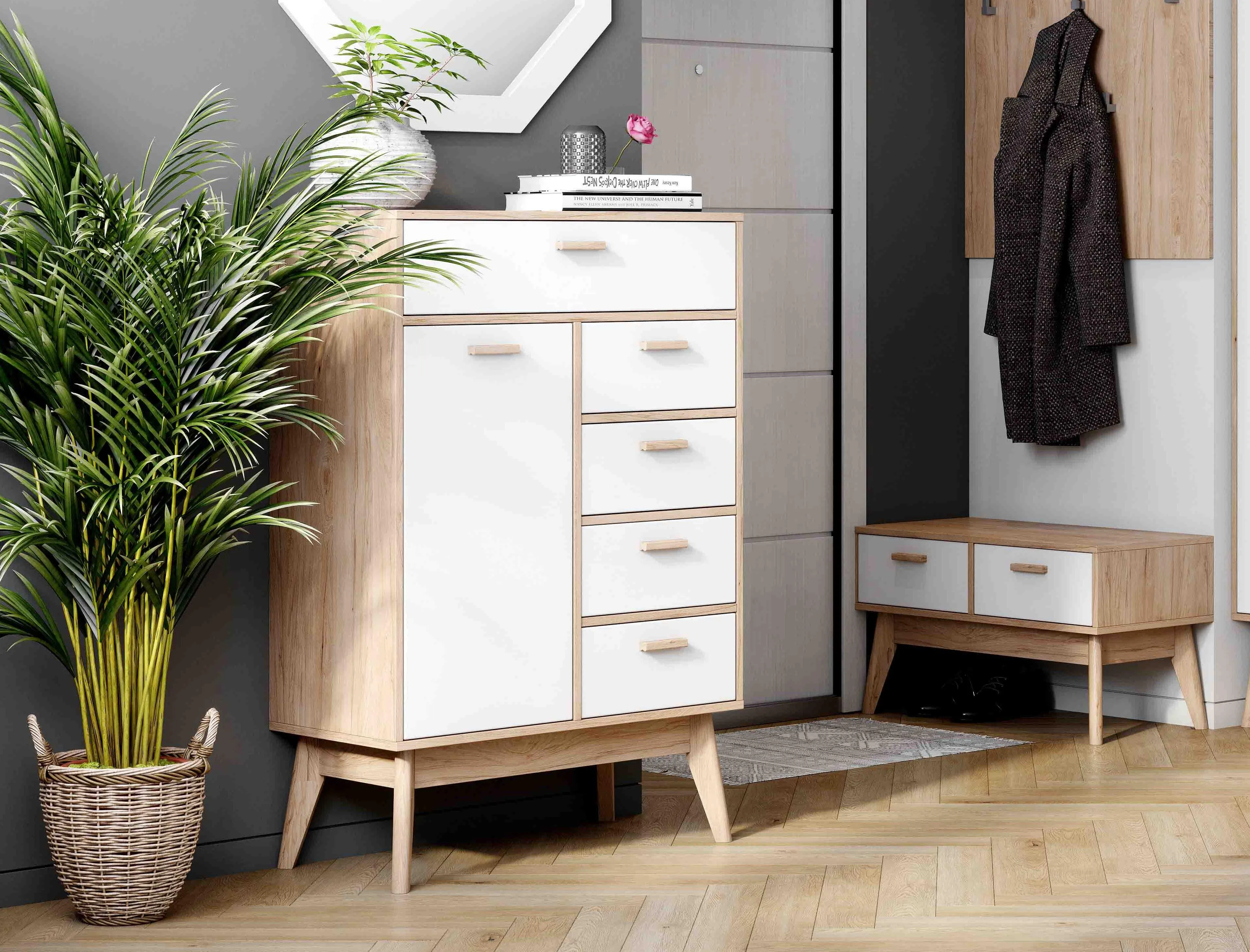 Высокий комод "Калгари" – это продуманная система хранения для прихожей, которая поможет избавиться от беспорядка. Закрытое отделение с двумя полками идеально подходит для хранения уличной и домашней обуви. Четыре выдвижных ящика предоставляют достаточно места для множества мелочей и аксессуаров, таких как обувь, зонты, перчатки, ключи и многое другое.