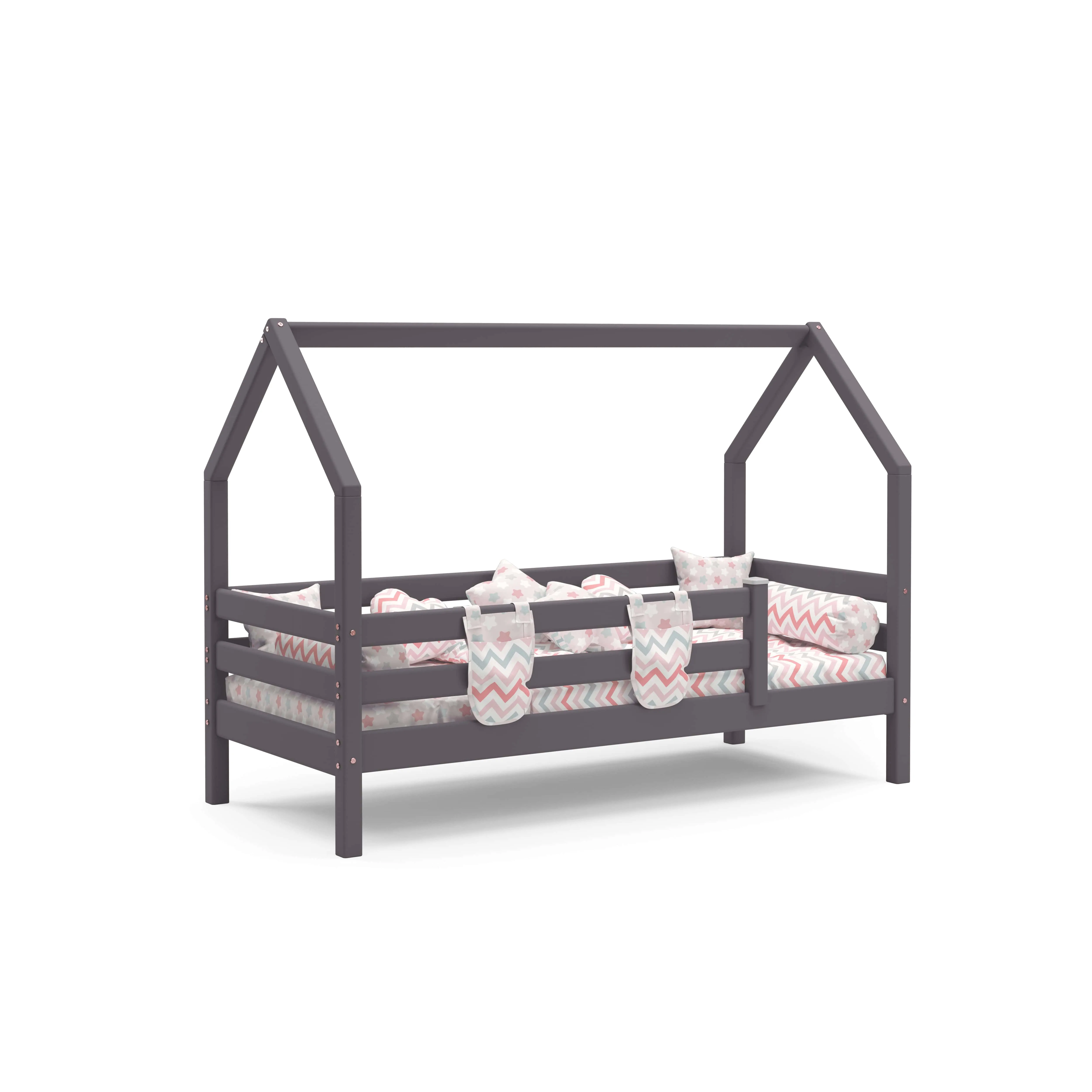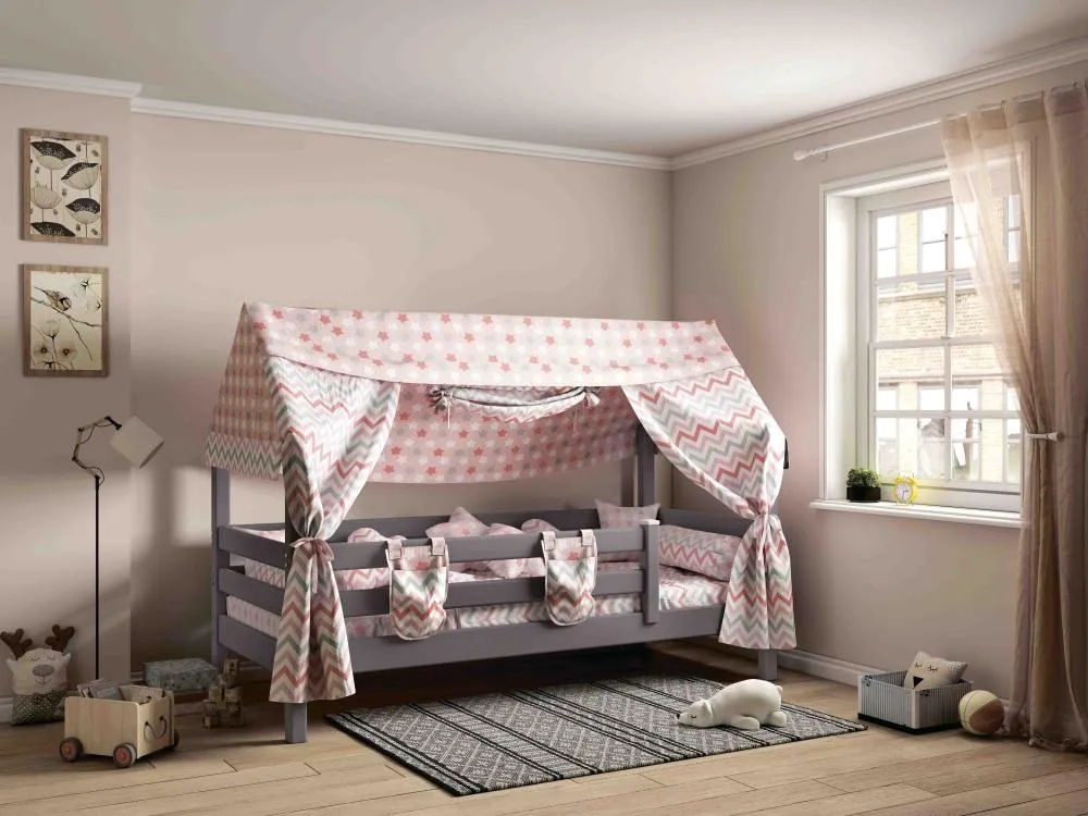 Уложить разыгравшегося ребенка бывает непросто – справиться с этой задачей поможет кроватка "Соня" с надстройкой в виде крыши домика. Дополненный текстильными элементами балдахин создает ощущение безопасности, настраивает на спокойствие, а в дневное время – может служить декорациями для пробуждающих воображение игр. Бортик по периметру защищает от случайного падения во сне.