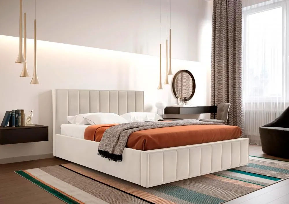 Кровать в мягкой обивке “Женева” является воплощением элегантной изысканности.