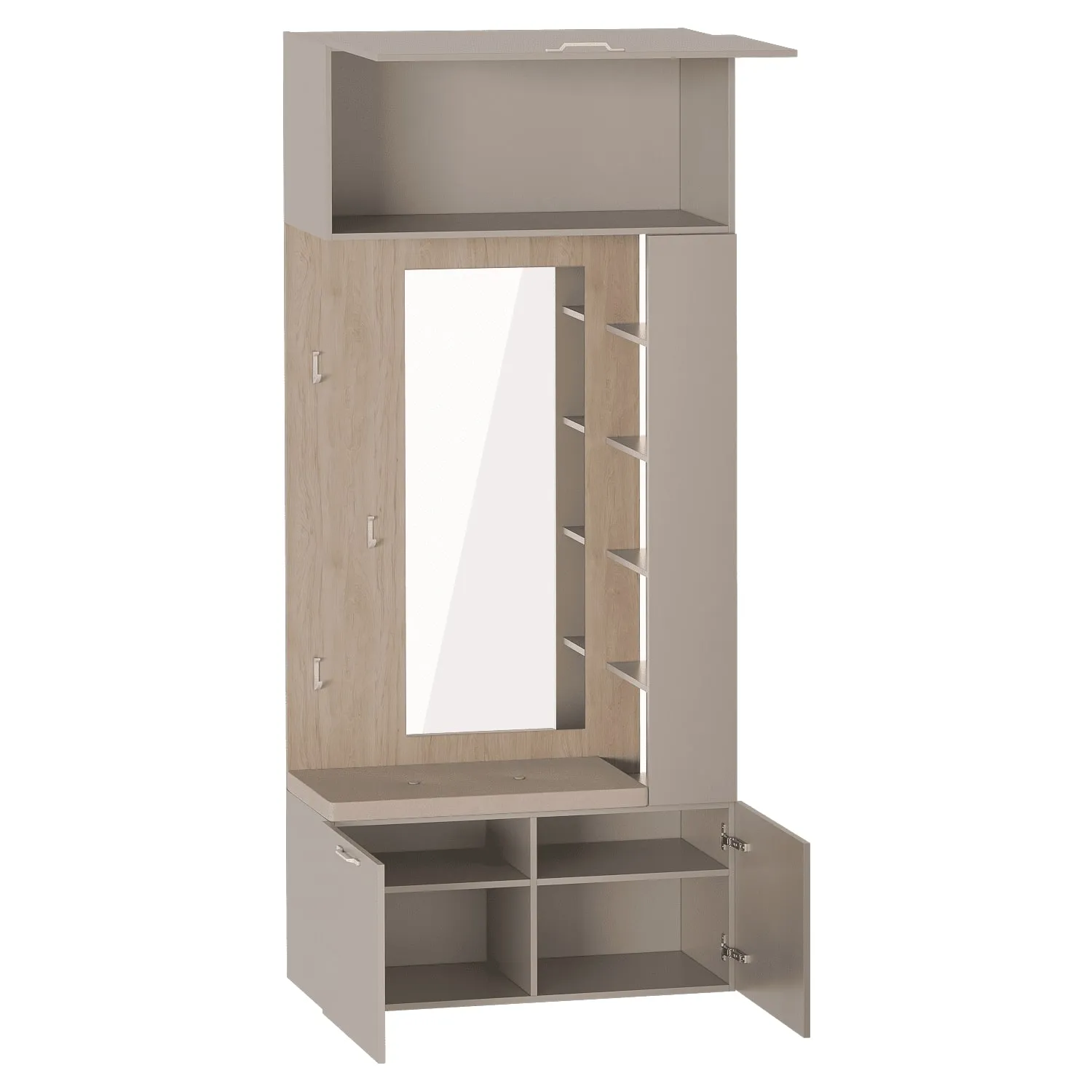 Модуль "Вешалка с зеркалом" выполнен из ЛДСП цвета Дуб натуральный светлый / Капучино. Верхняя полка модуля имеет встроенный газлифт и позволит разместить объемный чемодан. Вертикальный ряд полок выполнен на правую сторону, при желании можно распахнуть створку, прикрывающую ряд. Прочные крючки выполнены из белого матового металла.