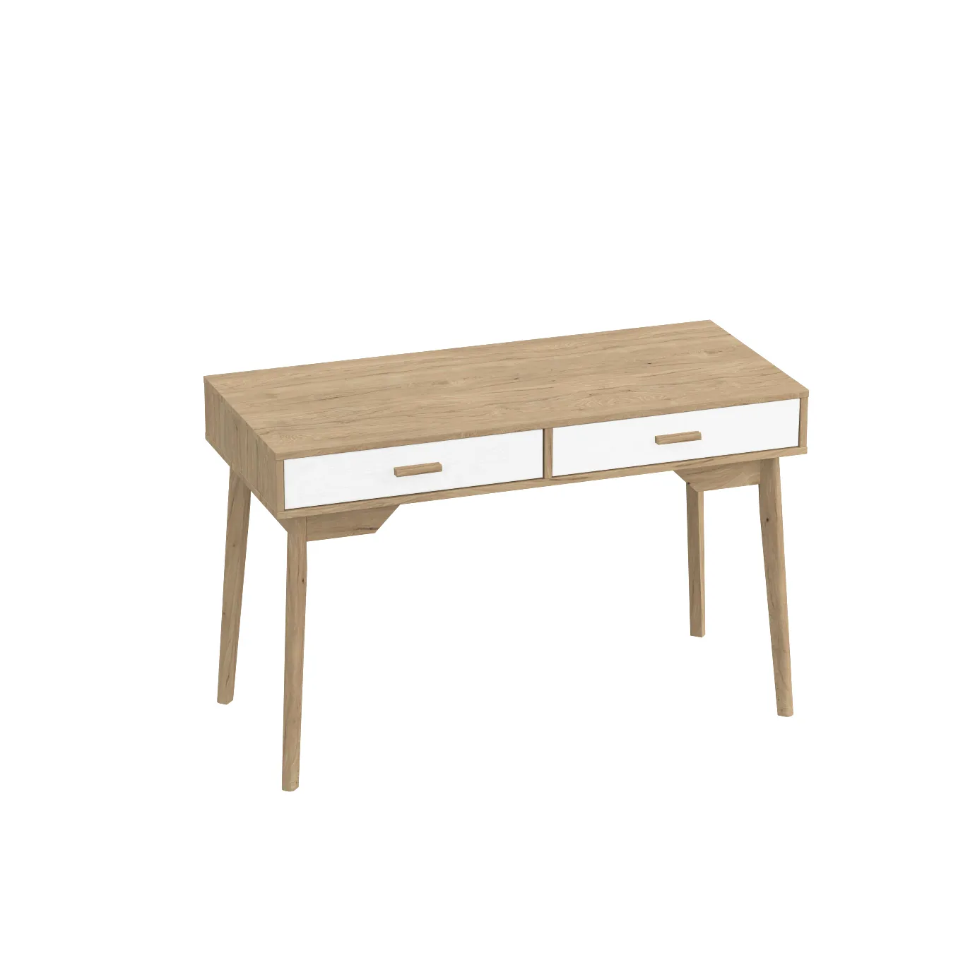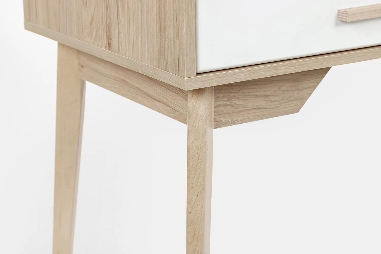 Столешница и корпус изделия выполнены из ЛДСП цвета натурального дуба, фасады ящиков - из МДФ, ручки - массив березы.