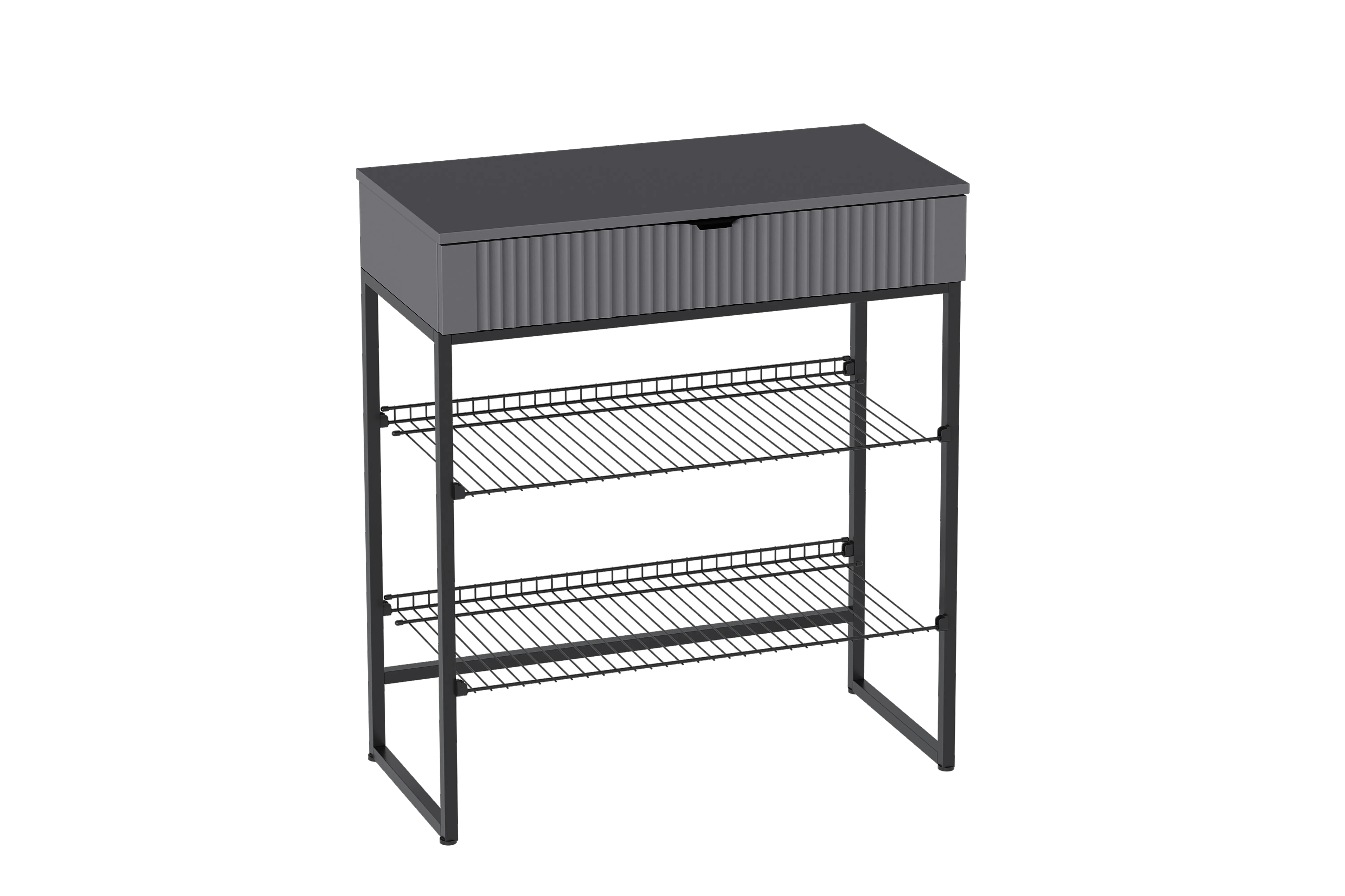 Тумба для обуви "Нора" состоит из несущего металлического каркаса и закрепленного к нему корпуса из ЛДСП , внутри которого установлен выдвижной ящик на шариковых направляющих с доводчиками. Между боковыми металлическими рамами закрепляются стальные сетки для хранения обуви.