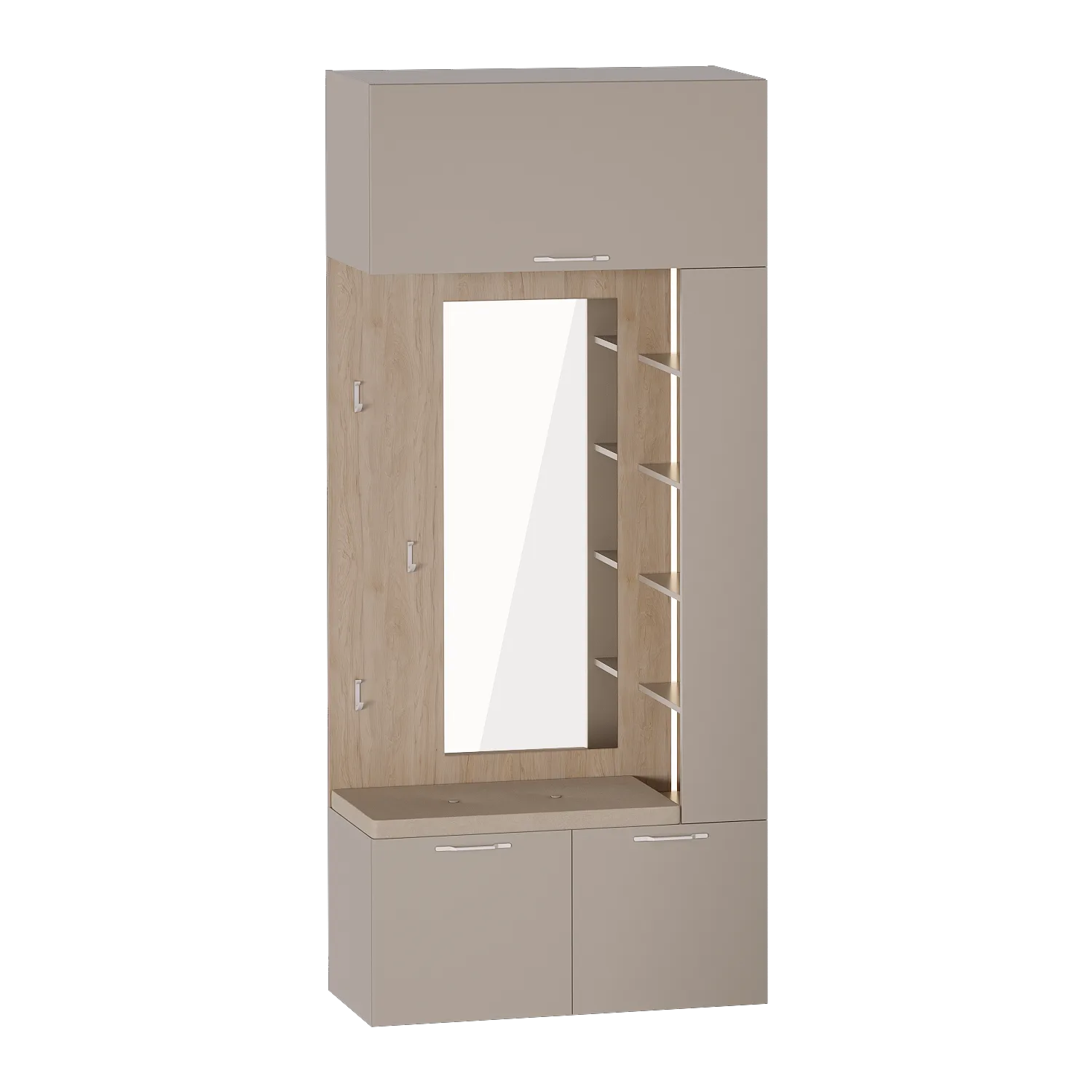 Верхняя полка модуля имеет встроенный газлифт и позволит разместить объемный чемодан. Вертикальный ряд полок выполнен на правую сторону, при желании можно распахнуть створку, прикрывающую ряд. Прочные крючки и ручки в форме скобы выполнены из белого матового металла. Все петли - плавного закрывания.
