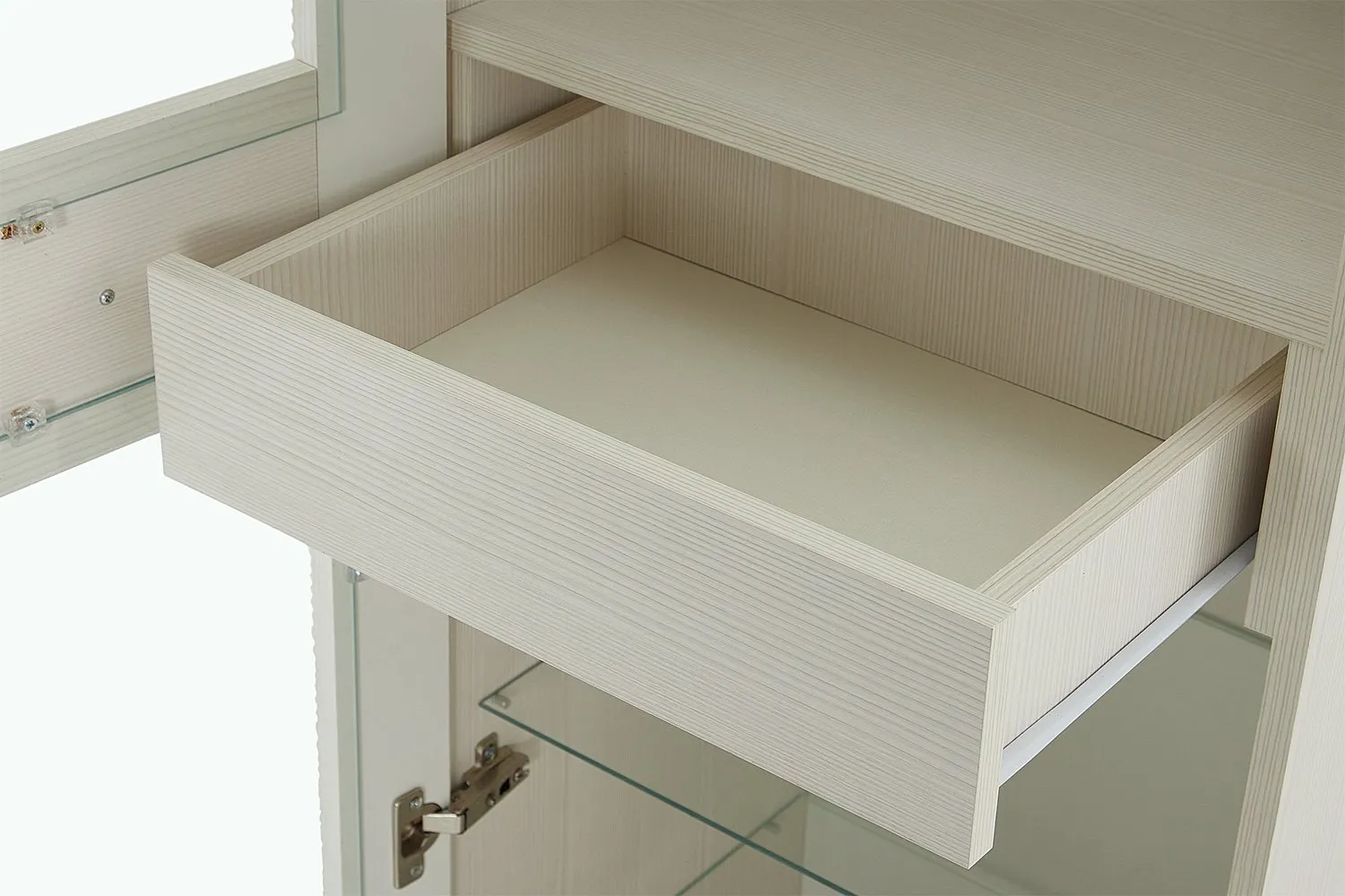 В витрине за общей стеклянной дверцей располагаются выдвижной ящик, четыре стеклянные и одна жёсткая полка. Четыре светильника «HLT Prismatic FT» для подсветки полок и блок питания в стандартную комплектацию не входят и приобретаются отдельно.